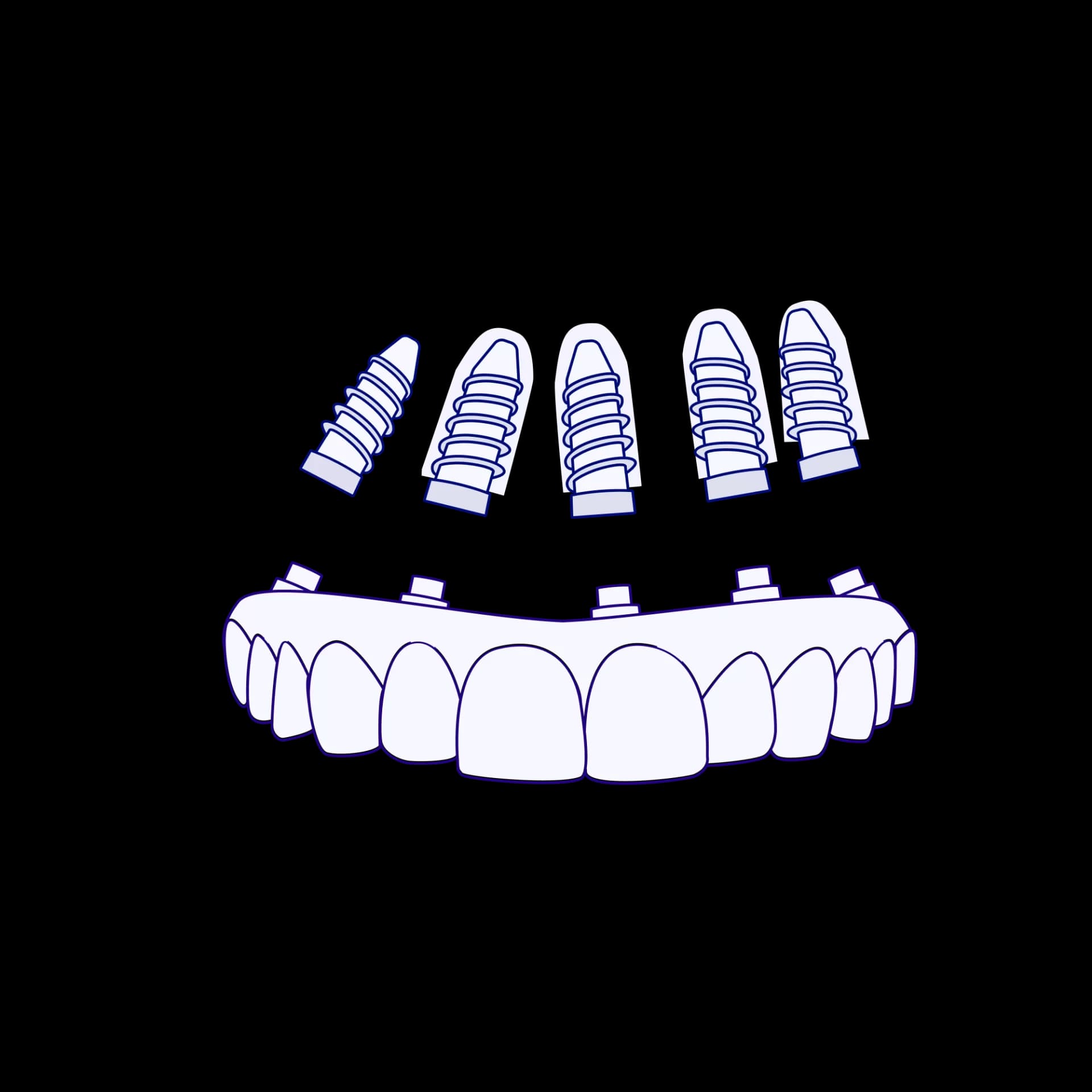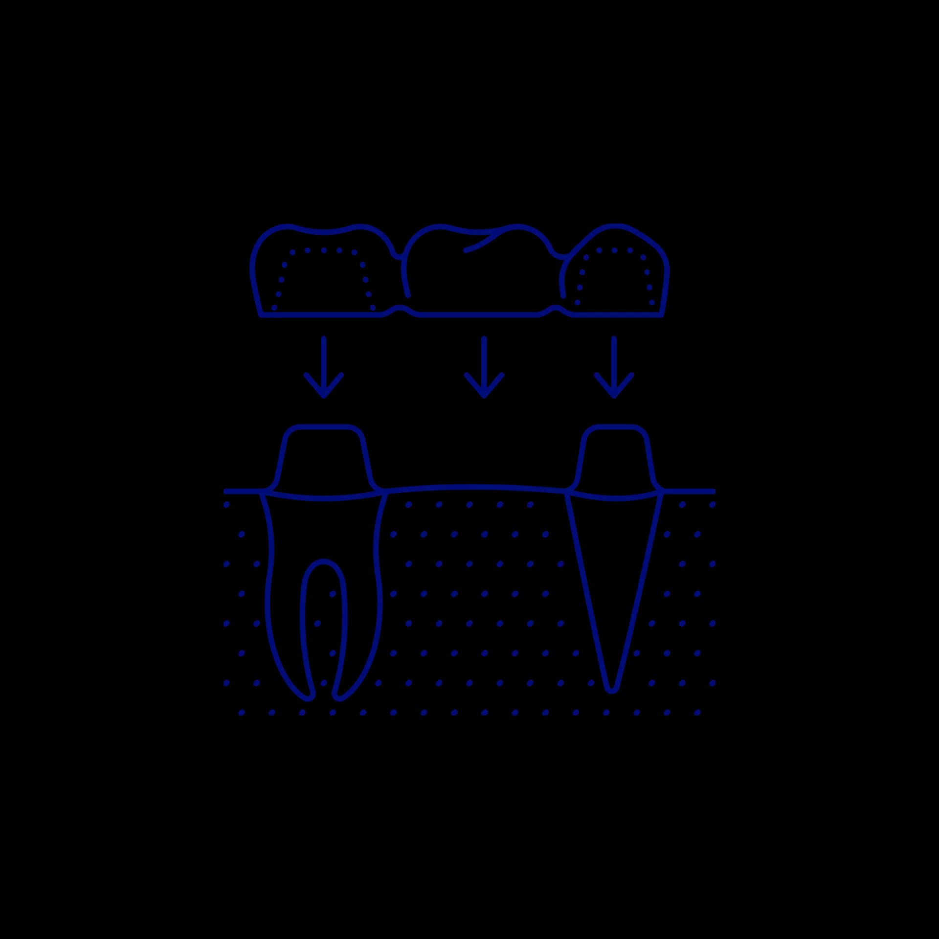 Two or more implants are placed to support a fixed bridge that replaces several consecutive teeth. This avoids preparing healthy teeth as you would with a conventional bridge.