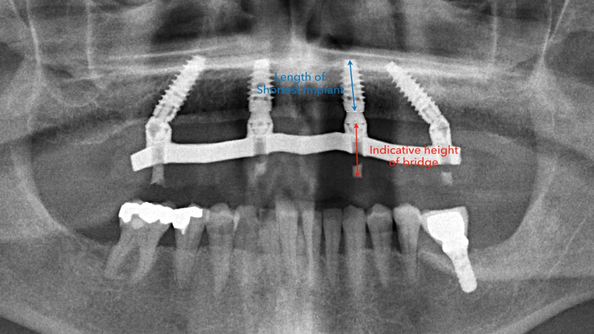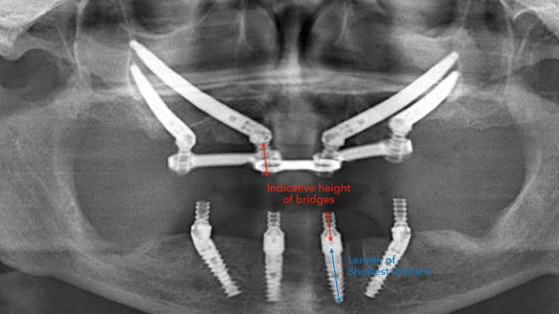 iii. Alignment on x-rays: there should be even spread, rigid connection between the implants, good bone levels, and the height of the prosthesis should be at least as tall as the shortest fixture (See pictures).