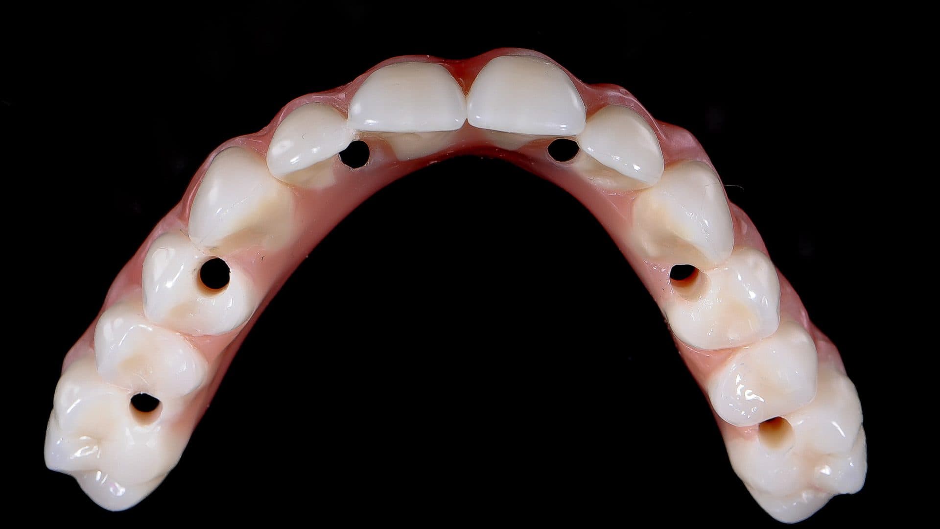 ii. The access holes for the screws are located near the edges of the front teeth and in the middle of the back teeth. Any deviation from this will severly affect level of comfort, speech, and also cleanability (See pictures);
